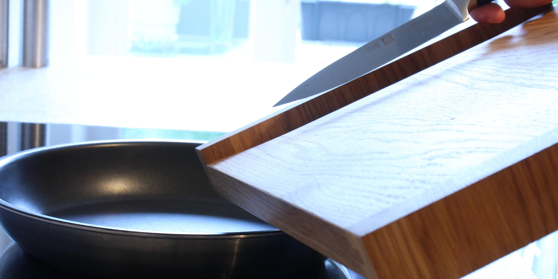 Ein echter Hingucker! Bitte nicht täuschen lassen: Obwohl der schräge Specht optisch leichtfüßig daher kommt, ist sie extrem belastbar, wie unsere Zenz. Der Specht ist ein massives Schneidebrett mit einer Saftrinne und Ausguss über die Ecke versehen. Die
