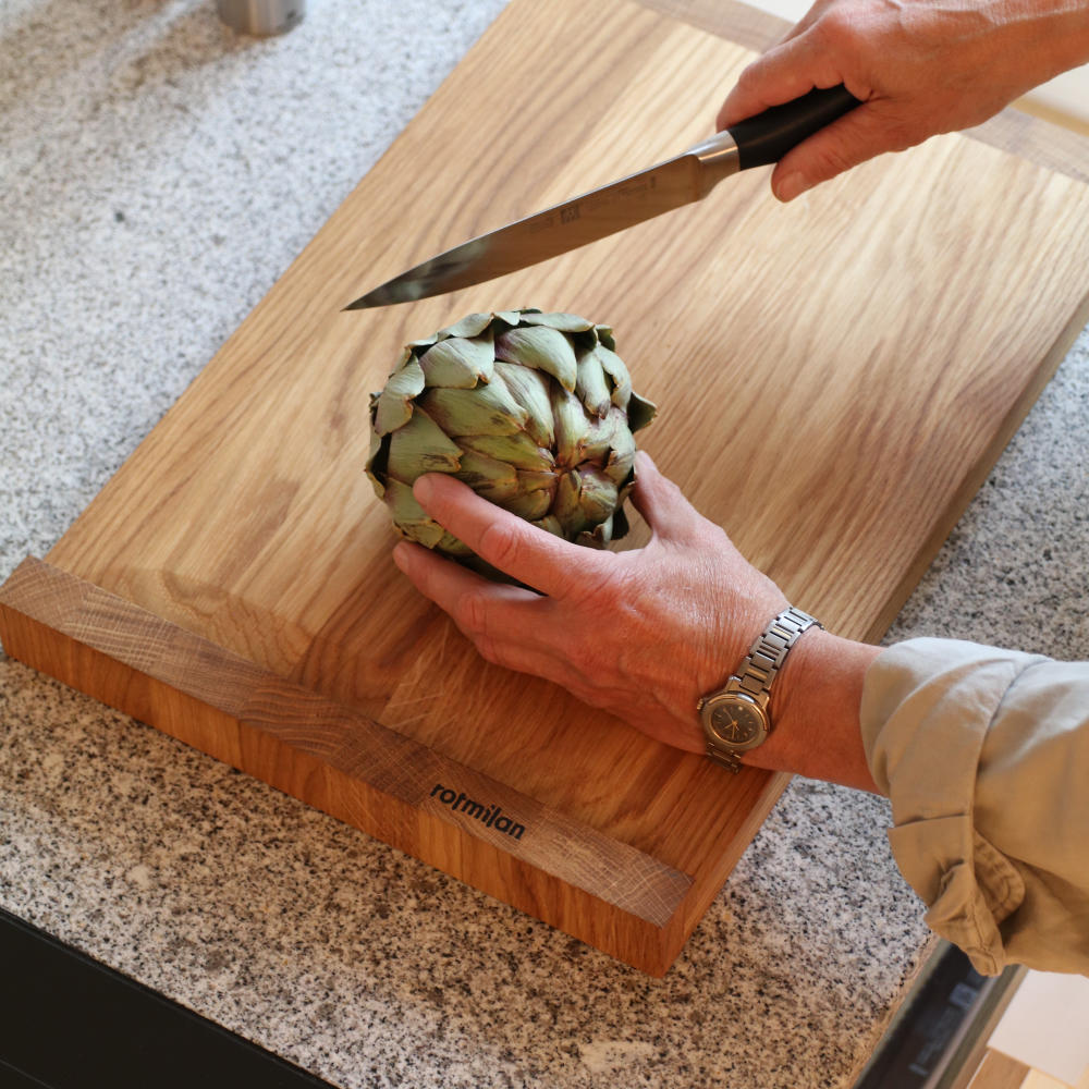 Schräge sorgt dafür, dass der Saft direkt nach unten abfließt. Wir stellen es aus all den einsamen Holzkanteln her, aus denen wir keine Möbel mehr machen können. Es ist beidseitig benutzbar und kommt mit einem lebensmittelechten Öl von Biofa geölt.