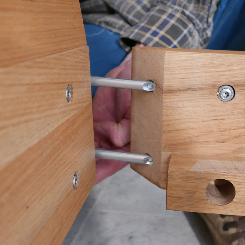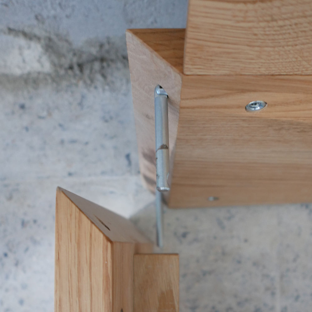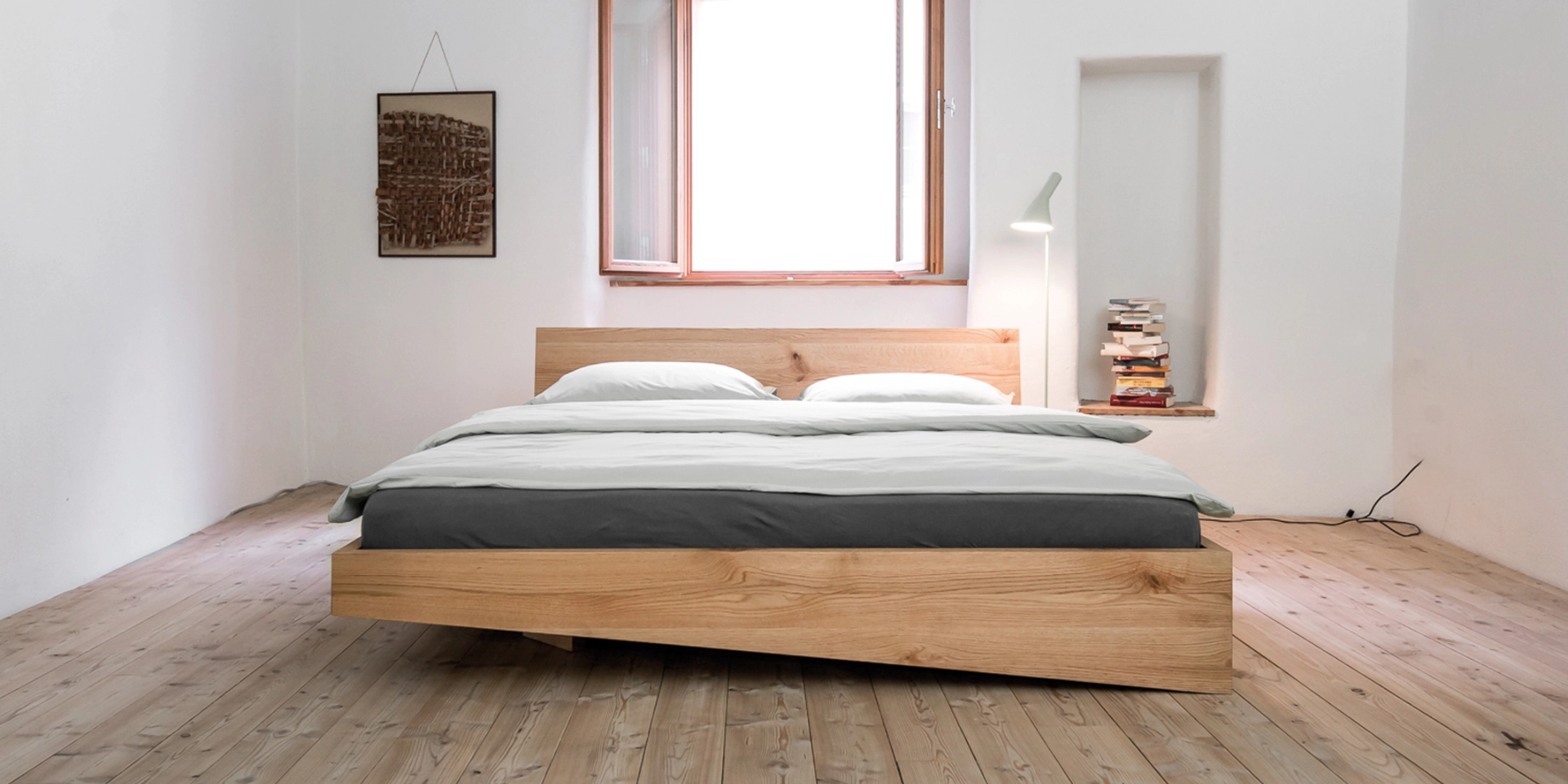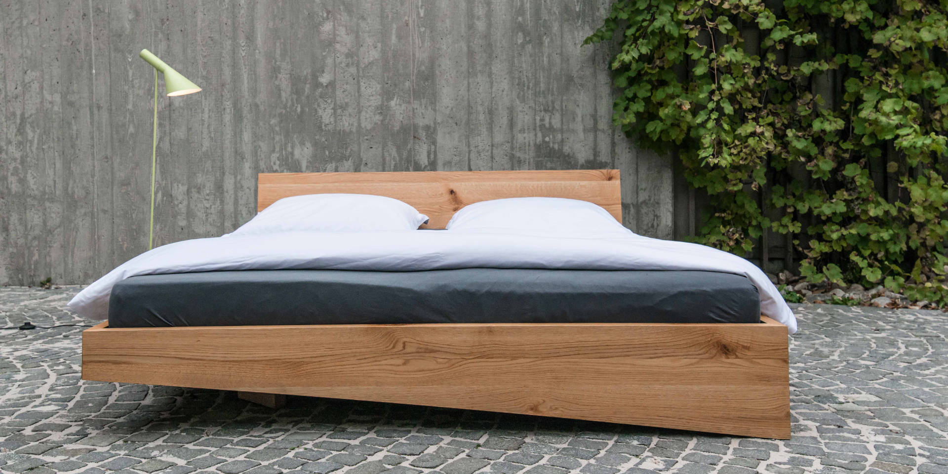 Natürlich voll-massiv. Erhältlich in sechs verschiedenen Holzarten (auf den Fotos in geölter Eiche), vier Breiten und mit oder ohne Kopfteil. Das Bett ist auch in Überlänge erhältlich.